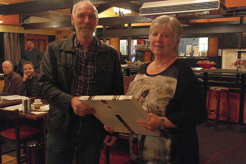 Karin Flinkop går av som redaktør for hjemmeside og Knut Jørgen overrekker et fat som takk for flott jobb